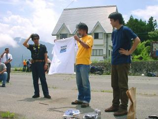 賞品となったアメリカ土産のTシャツの説明をされる永山さん。
