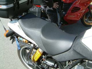 フランスのSECDEM製の大型スクリーンを装備して旅仕様化。右はローシートにアンコ盛りしてシート高さを大幅に上げてます。オーリンズもなかなか♪