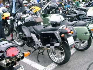 コルビンのシートに珍しいACシュニッツァーのホイール等で完全武装したK1200RS。隣のSのシャークマフラーも迫力充分。