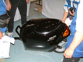 最大140リットル/50Kgの積載量でサスペンション装備で200キロ走行にも耐え、簡単に外してホテル内にも持ち込めるという優れもの。
