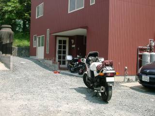 シートJOYのアトリエの前で。赤い風呂敷包みの中は私のR1100RSの黄色いシート。
