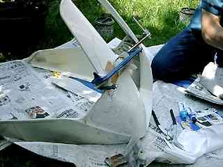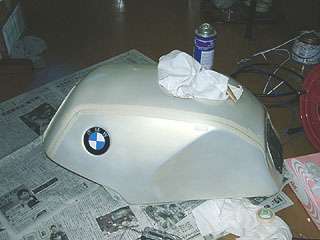 8月30日 早朝作業も佳境に入ってきた・・・と言いたいところだけど、エアブラシの調子が悪くて上手く吹けない(もともと上手くもないけど)。結局時間ばかりかかって大してはかどらなかった。 それからマスキングだけしておいたタンクにタッチペンでラインを描いたけど、これもいまいちの出来だった。マスキングテープの押さえが甘く、何箇所かはみ出てしまったのだ。仕方ない、後で修正するとしよう。 更にこの時ウレタン用のシンナーの栓を締め忘れたらしく、それが私が留守の間にこぼれてボトル一本あったシンナーが残りわずかになってしまった。ぬう。