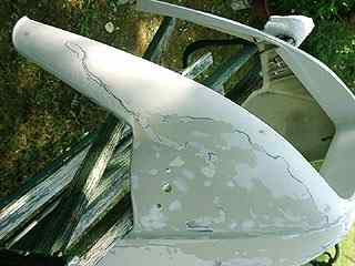 家に帰ってから外が暗くなるまでのわずかな時間に白サフェイサーを吹いてしまったのだが、後でよく見てみると何とクリアーが黄変していた部分の塗装は下地もかなり痛んでいたらしく、サフェイサーに含まれているシンナーで下地が縮んでしわしわになってしまっていた(-_-メ) まいったねこりゃ。