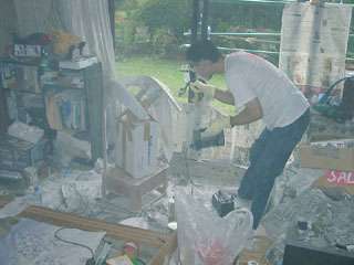 8月2日 調色を頼んだパールホワイトが出来あがってきたので受け取りに行ってきた。自動車のドア一枚分ほどの塗料を頼んで、税込み8400円。塗装屋に言わせると「一万円でも合わないよ!」という代物らしく、何も言わずとも値切り交渉までしてくれた自動車屋さんには改めて感謝。しかし塗装工程が面倒なのはさすがパールカラーで、まず下地が隠れる位に硬化剤を2割混ぜた白を吹き、生乾きになったところで硬化剤を2割混ぜたパールを薄く二回から三回にわたって吹きつけ(四回では厚くなり過ぎるらしい)それが完全に乾いたら硬化剤を5割混ぜたクリアーを二回ほど吹き付ける・・・というものだった(^_^;)
