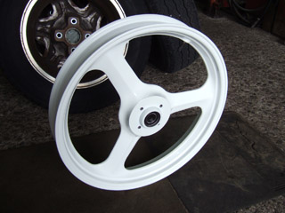ヤフオクで入手した後ろのホイールは前の所有者の方が「西村コーティングでマルケジーニホワイトで塗装しました」