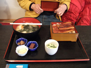 割り箸の長さや携帯と比べるとよくわかります。それにしてもうな丼の重箱より大きなお椀ってどうよ(^^;)