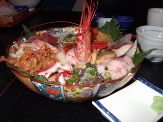 これは名物の海鮮丼。どんぶりはやや浅めでご飯は見た目より少な目。具の種類と量は尋常じゃありませんでした(@_@)