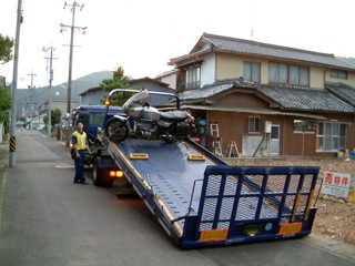 それから積み込み&固定作業にかかったのだが、やって来るのは当然MOJと契約した地元のレッカー会社で