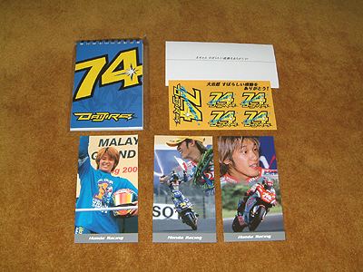 加藤家が配ったメモ帳(左上)とホンダレーシングが配ったお礼の品。